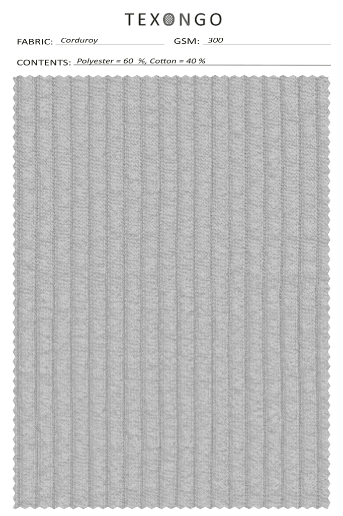 Diameter:-Â 62 inches /Â 157.48 cm GSM:-Â 300 TYPE:-Â OPEN Ounce:-Â 9 oz Blend:-Â 60% Cotton 40% Polyester Knit Style:-Â Corduroy Usages:- Restock:-Â No Reorderable:-Â Yes
