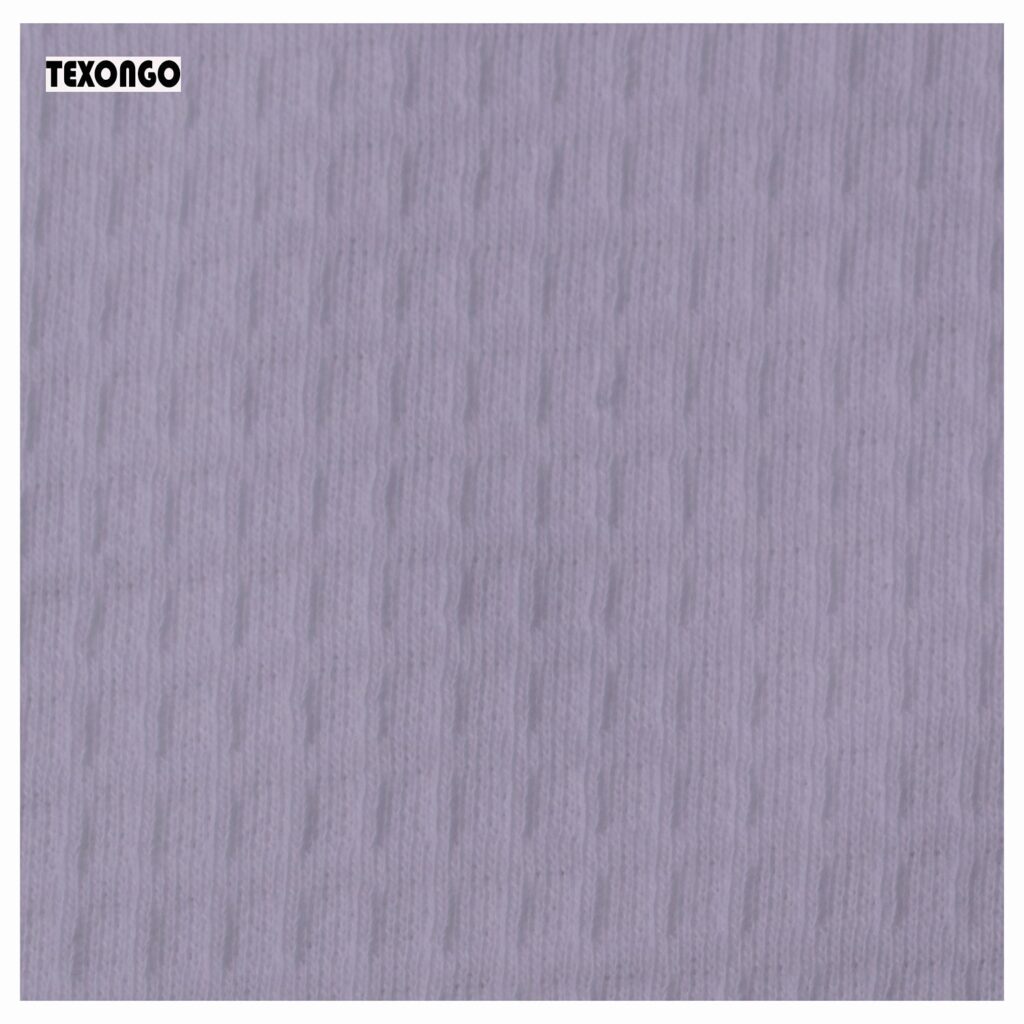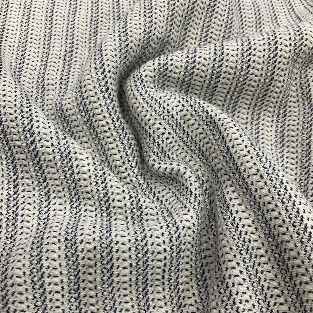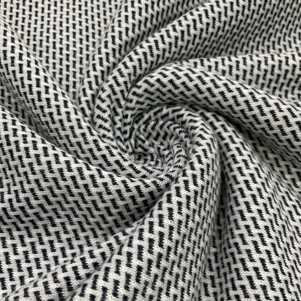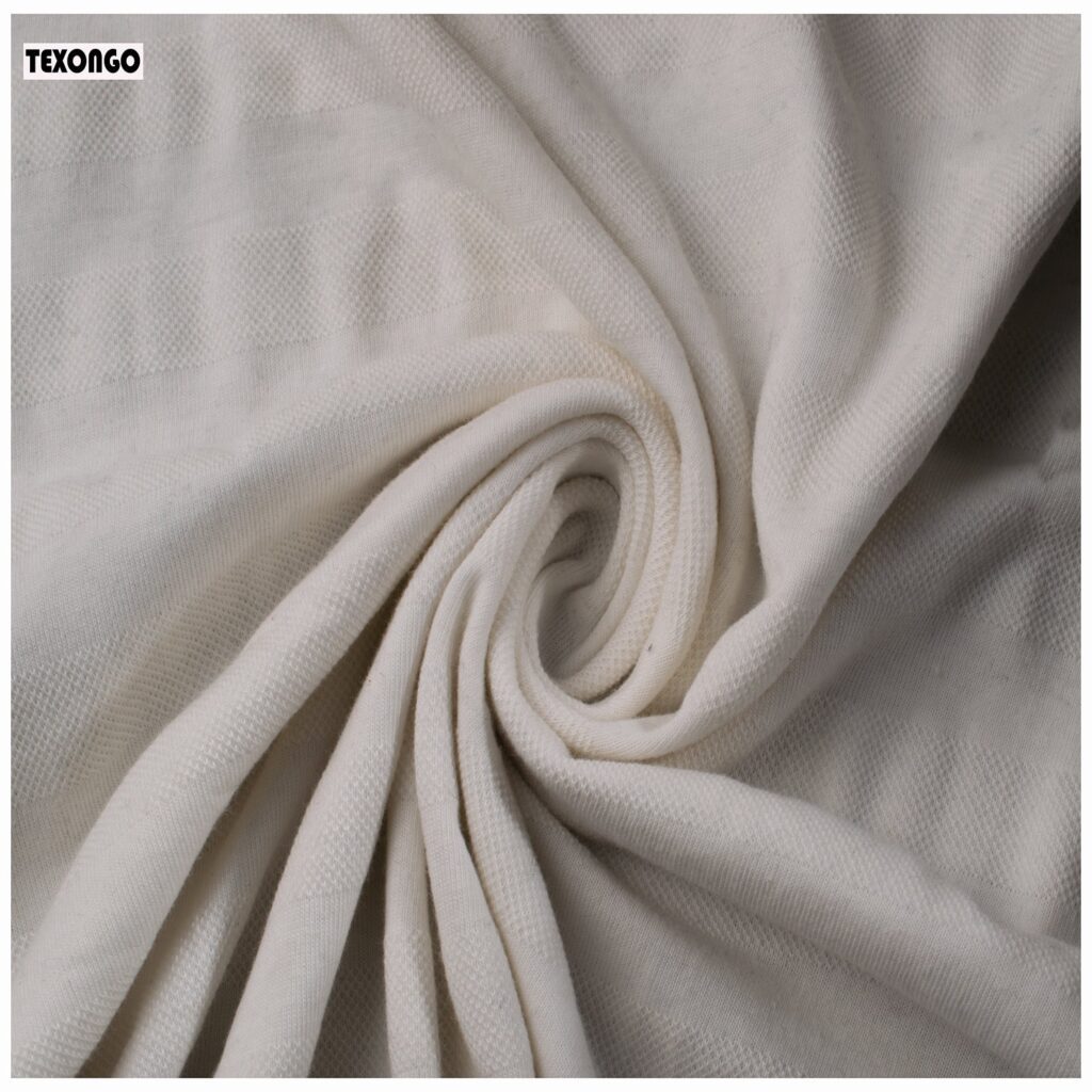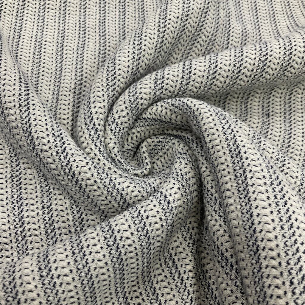 Cotton jacquard is a type of knitted fabric known for its soft, comfy feel and aesthetic, The textile is also notably stretchy while traditional cotton doesn’t have this flexibility, the knitting technique gives it an elastic quality, even without blending synthetic fibers like elastane or spandex. It is soft, stretchy, naturally absorbent, breathable, and wrinkle-resistant.